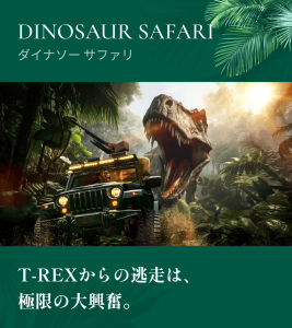 リアルに動く巨大な恐竜たちが生息するエリアを、専用の装甲車に乗って探検するスリル満点のアトラクションです。