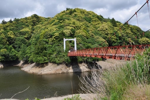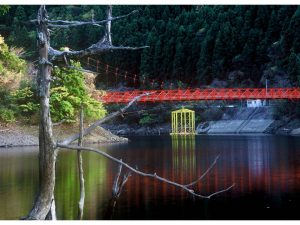 金山ダムのダム湖には、その景観のアクセントともなっている象徴的な赤い吊り橋「金山ダム船代橋」が架かっています。