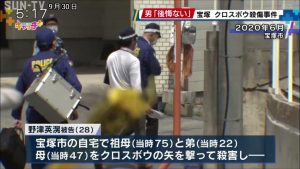 「宝塚ボーガン殺傷事件」は、2020年6月4日午前10時15分頃に発生。野津英滉がボーガン(洋弓銃)で自身の祖母(好美さん、事件当時75歳)、母親(マユミさん、事件当時47歳)、弟(英志、ひでゆきさん、事件当時22歳)の3人を殺害し、伯母(事件当時49歳、西宮市在住で事件発生直後に来訪)にも重傷を負わされたという衝撃的な事件です。