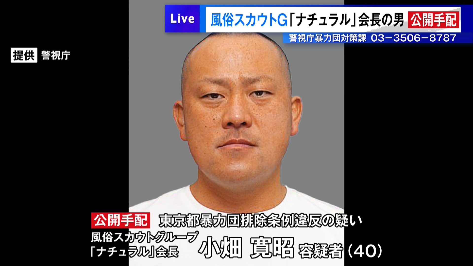 女性を性風俗店に紹介するスカウト行為を容認してもらう見返りに暴力団幹部にみかじめ料を支払ったとして、警視庁暴力団対策課は21日、東京都暴力団排除条例違反容疑で、国内最大級の風俗スカウトグループ「ナチュラル」のトップとされる住所不定、職業不詳小畑寛昭容疑者(40)を公開手配した。同課によると、容疑者は組織内で「会長」と呼ばれている。
