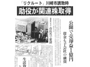 1988年6月18日、朝日新聞が「川崎市助役へ一億円利益供与疑惑」とスクープしたことが始まりです。川崎駅西口の再開発プロジェクト「かわさきテクノピア」において、建物の容積率を緩和してもらう見返りとして、市の助役にリクルートコスモス株が譲渡されたのではないか、という内容でした。