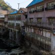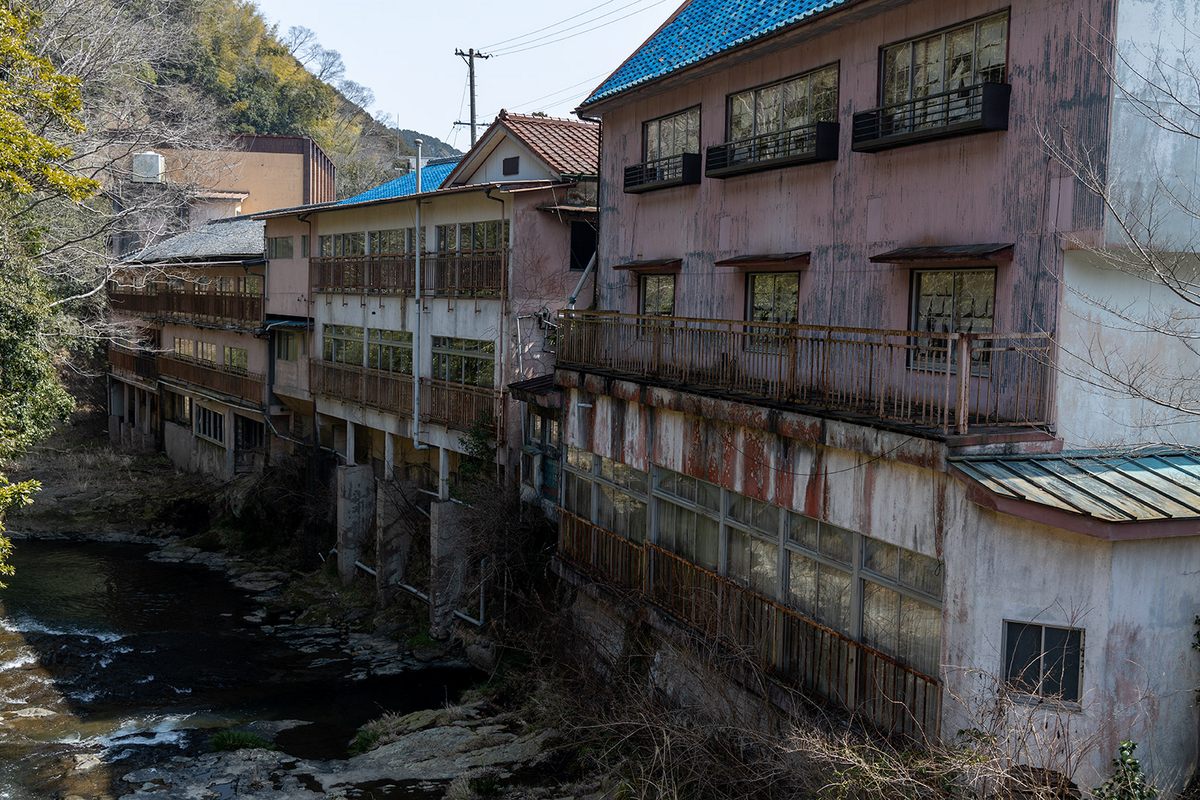 これらの廃墟群が川沿いに並ぶ光景は、営業中の旅館と静かに朽ちていく建物が混在する、榊原温泉の複雑な状況をよく象徴しています。